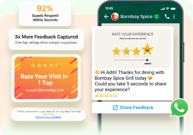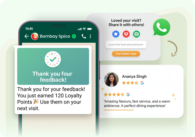 Automatically send personalised feedback requests via WhatsApp just minutes after your guest finishes dining, no spam, just perfect timing.